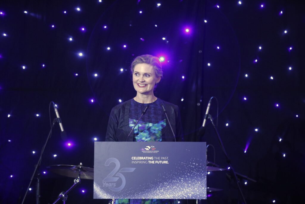 “Dhoma Amerikane është bërë një nga zërat më të besueshëm dhe të respektueshëm në vend dhe mbetet një faktor kyç në forcimin e zërit të komunitetit të biznesit” – vlerësoi znj. VanHorn rolin e AmCham, duke përmendur fakte konkrete të përmirësimeve ligjore dhe rregullatore që kanë ardhur si rezultat i punës dhe ekspertizës së organizatës.